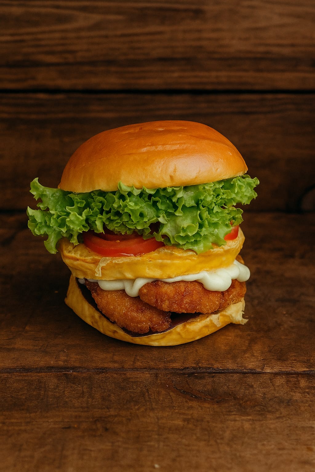 Pão de brioche, Frango empanado, queijo, catupiry, barbecue, alface, tomate e catchup.